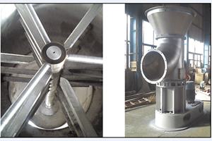 底部強化器設(shè)計獨特,攪拌齒為菱形,其流線性能使風(fēng)阻達到低,設(shè)置在圓錐形料斗內(nèi),分動刀和定刀,粉碎效果顯著,使下落的結(jié)塊物料迅速粉碎為適合氣流干燥的粉粒料,攪拌的另一個主要作用是分散物料,加大了與料斗下面進來的高速熱風(fēng)的接觸面積,于是料斗區(qū)形成了一個強烈傳熱傳質(zhì)的流化床,大部分濕分在料斗區(qū)燥。隨著干燥的進行,變輕變細的干料受氣流作用明顯,與氣流一起上升并進一步干燥,然后從干燥塔頂部出來進入物料收集系統(tǒng)。