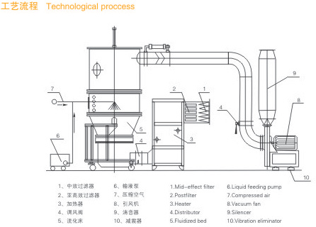 物料粉末粒子,在原料容器(流化床)中呈環(huán)形流化狀態(tài),受到經(jīng)過凈化后的加熱空氣預(yù)熱和混合,將粘合劑溶液霧化噴入,使若干粒子聚集成含有粘合劑的團(tuán)粒,由于熱空氣對(duì)物料的不斷干燥,使團(tuán)粒中水分蒸發(fā),粘合劑凝固,此過程不斷重復(fù)進(jìn)行,形成理想的、均勻的多微孔球狀顆粒。
